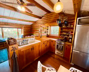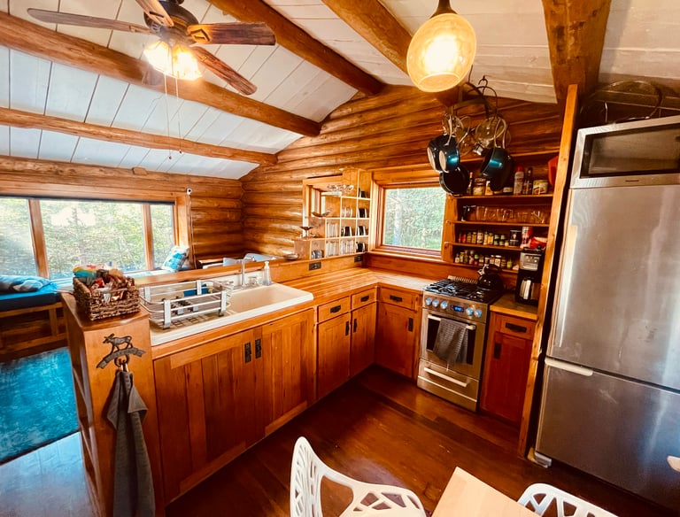 Early 1900s Hand-Built log cabin, with 450 Sq Ft of space, a full kitchen, primary queen bed suite with full bathroom, iron claw-foot tub and living room space for 5.